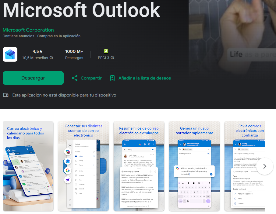 "Muy fácil de usar, con numerosas funcionalidades (agenda, priorización de tareas, etc.). Posibilidad de crear carpetas/subcarpetas para facilitar la gestión de emails" (Fuente: Google Play Store)
