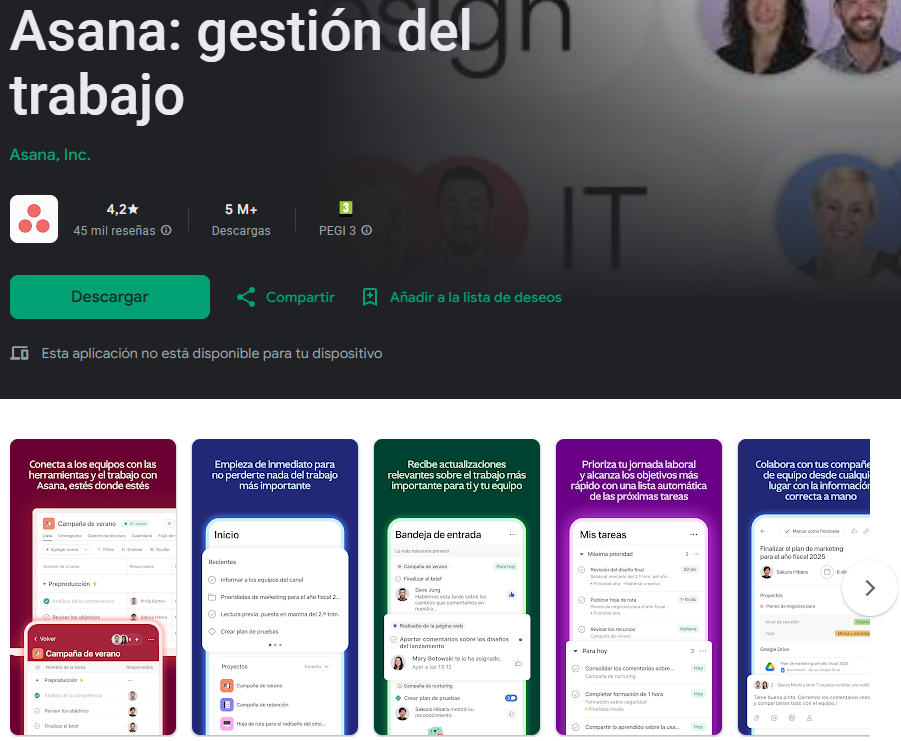 Asana es una plataforma de gestión del trabajo en equipo, con herramientas de planificación, seguimiento de tareas y colaboración.