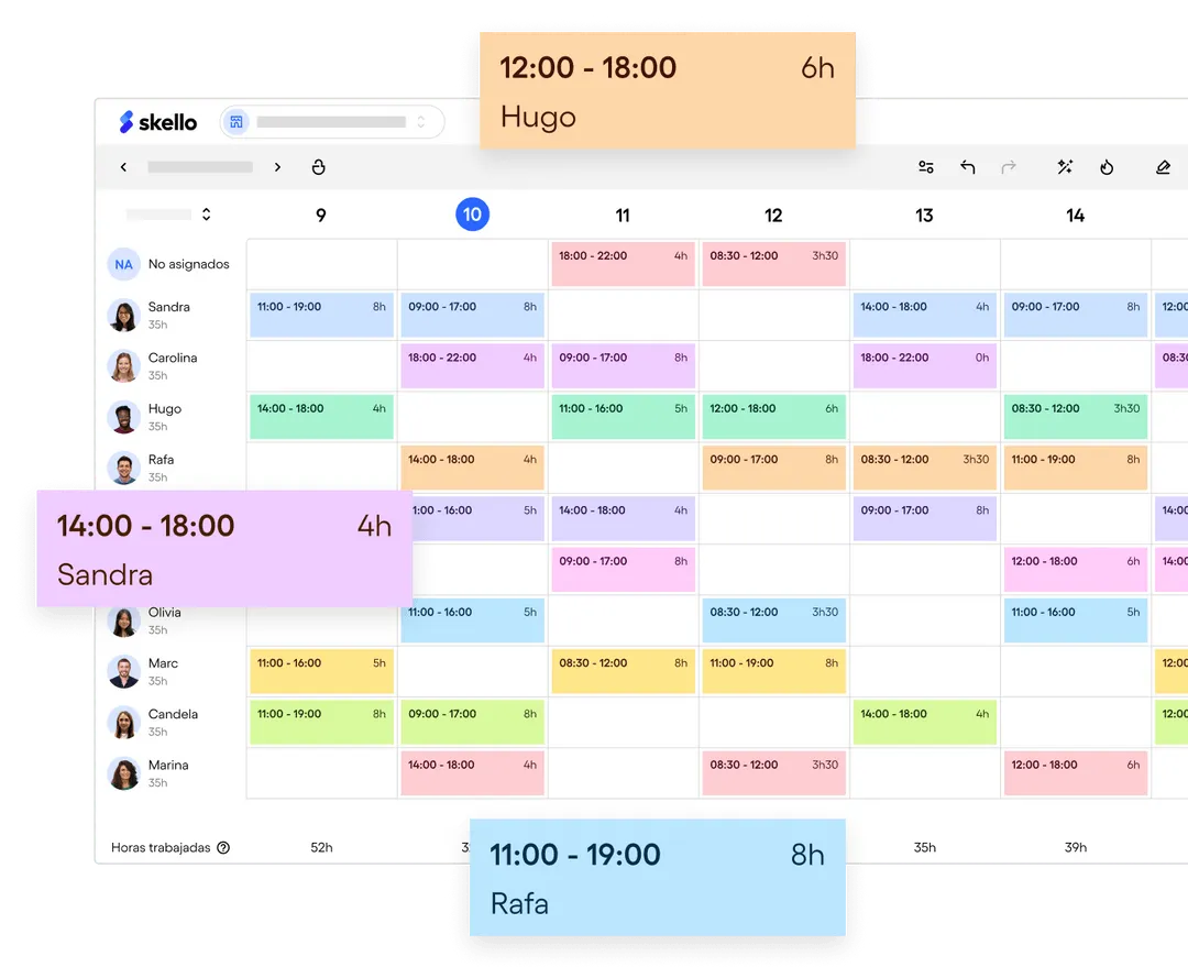 La app del empleado permite consultar horarios, contratos, nóminas y saldo de ausencias, y solicitar vacaciones o cambios de turno desde el móvil. Para managers de múltiples locales, Skello centraliza toda la planificación en un único entorno, con visibilidad en tiempo real de quién trabaja en cada momento.