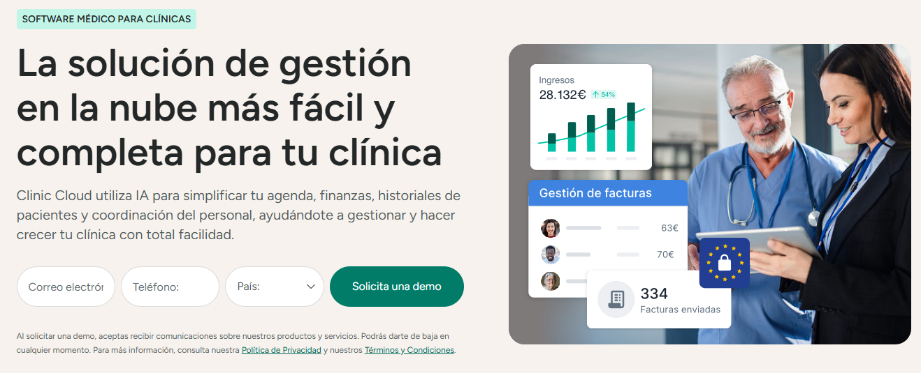 Clinic Cloud es una solución 100% cloud diseñada específicamente para el mercado español, adaptable a múltiples especialidades: odontología, fisioterapia, estética, podología, psicología y policlínicas. Con más de 1.000 usuarios activos, ofrece una relación calidad-precio muy competitiva.