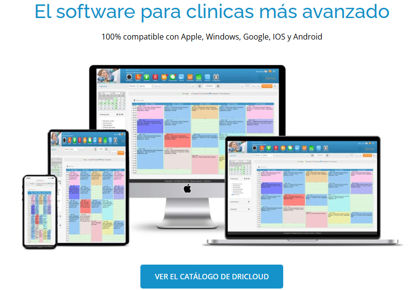 DriCloud destaca especialmente en la fidelización y comunicación con pacientes: portal del paciente, app móvil, recordatorios automáticos, campañas de marketing, tienda online y sistema de reseñas. El cumplimiento normativo es exhaustivo: RGPD, LOPD, HIPAA, control horario obligatorio.