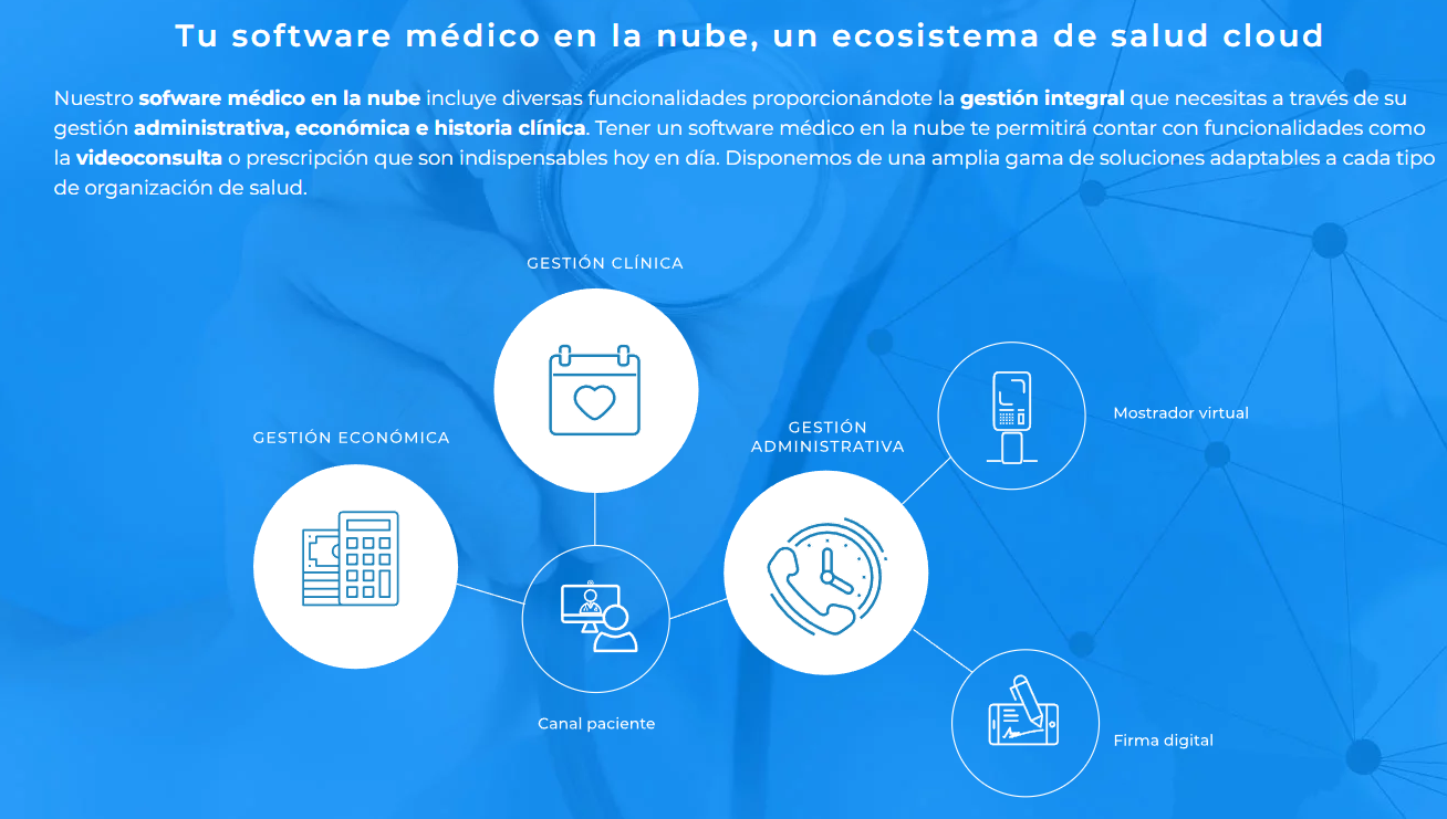 La plataforma ofrece una arquitectura modular que integra gestión administrativa, económica, historia clínica electrónica, portal del paciente, firma digital y mostrador virtual. Su principal fortaleza reside en la integración directa con las pasarelas de pago de las principales aseguradoras españolas (Adeslas, Sanitas, DKV, Asisa).